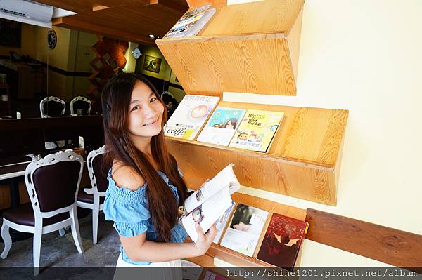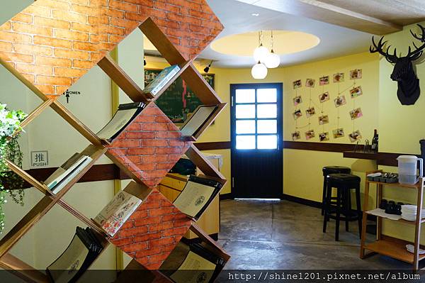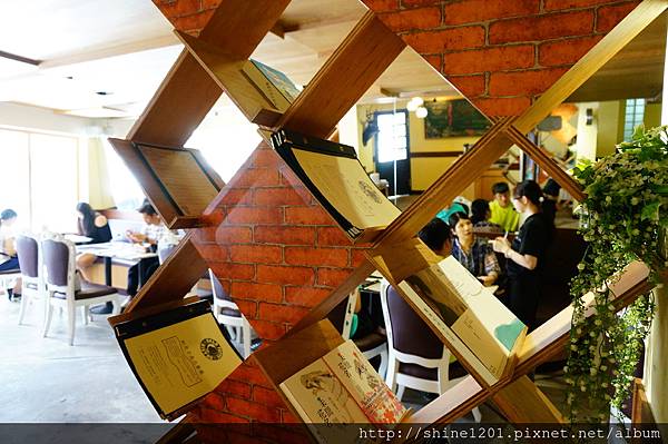中和肥禿子美式餐廳內也以菱形格造型磚牆置物櫃提供了小說、旅遊等書籍