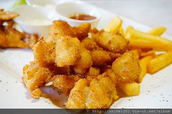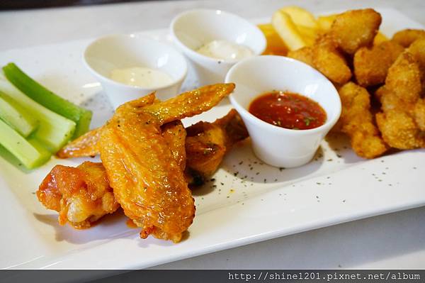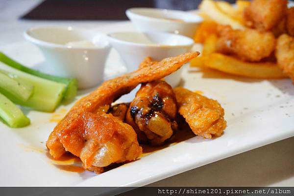 【內容】水牛城辣雞翅、酥炸炸花枝左塔塔醬.海軍醬、薯條、芹菜棒