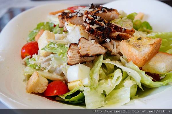 滿滿大份量的沙拉裡,還有條狀水煮蛋、酥脆麵包丁、華麗如雪般地的乳酪刨絲