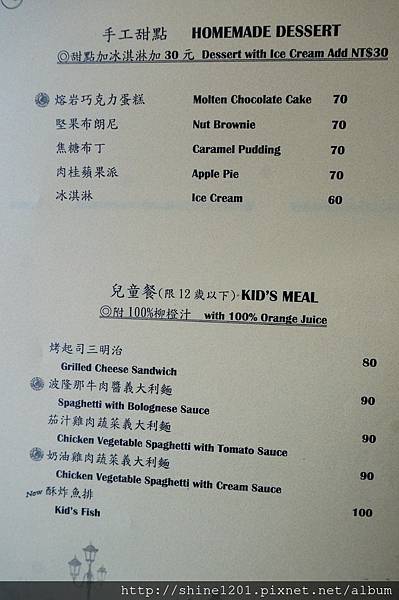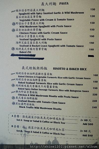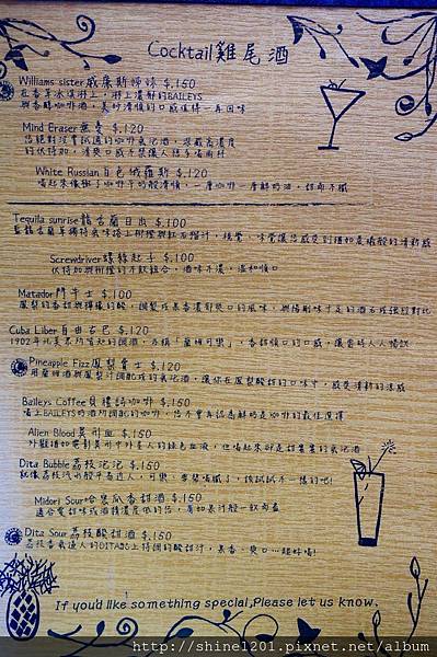 提供餐點義大利麵、燉飯、焗烤飯、漢堡、輕食三明治、雞尾酒調酒等