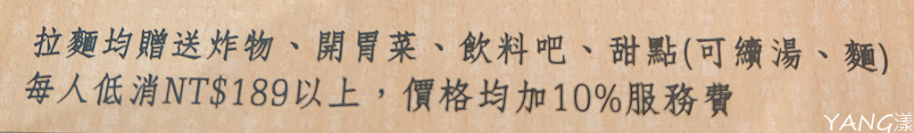 某天下午上班到一半,麵友傳訊來問要不要下班後衝,想了一想後就答應他了(因為他開車啊)。店家就位在漁人碼頭南端入口外面停車場旁,因為四周黑暗無人,非常好找。走進店裡,挑高空間的店內空間,將半開放廚房設在一進門處,才剛踏進店裡就可以看到內場如何熬湯、煮麵、擺盤,當天我實際有看到熬煮湯頭的部分材料,表示這家湯頭不是用粉沖泡,可以安心食用。因為是平日,店裡用餐人數少,服務生帶領我們就定位後,給了我們菜單,並解說點餐方式。這裡是先選配料,有炭燒沙朗(原本是炭燒牛舌,現在被貼成沙朗)、炭燒牛五花、炭燒安格司牛、炭燒煙燻豬五花、日式燒雞、野菜,還有限定的叉燒、日式叉燒年糕、炸銀鱈共九種,由配料決定價格。接著從鹽味、醬油、味噌三種湯頭中選一種,在來就是從和風沙拉、韓式泡菜、和風丁香、黑胡椒毛豆、涼拌海帶牙五種小菜中選兩種。炸時疏則是由店家依據當天材料提供。另外也有炸物可單點,如果覺得兩道小菜不滿足,也可付費加點。店內設有低消$189,並收取10%的變相漲價費(俗稱服務費),只要點最便宜的野菜拉麵就可達標。這裡強制將拉麵包裹小菜販售,不但可提高售價,連帶也拉高了變相漲價費,以我點了炭燒沙來來說,$269加上$27的變相漲價費後,就要$296,點餐時我沒注意到有變相漲價費這件事,如果有注意,單純只是來試味道的我就會點便宜一點的。對於包裹販售這件事,有些人會認為搭成套餐很澎湃,但我個人不喜歡這種強迫推銷的方式。