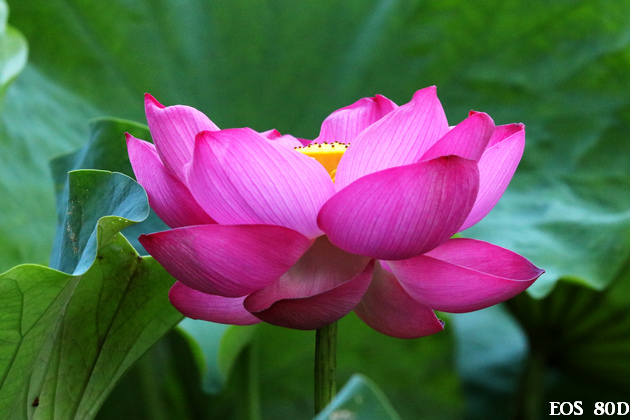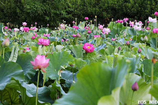 下圖,我蹲在荷花底下喬好久,失敗很多張,終於可以讓荷葉、荷花與花苞,完整入鏡囉!
