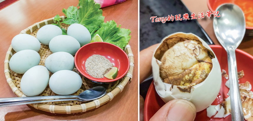 ▲這一道是沒在菜單上的越南傳統小吃〝鴨仔蛋〞,本來應該是用更熟的鴨蛋,但好友因為之前有告知會來吃,所以老板特別準備了這幾顆〝鴨仔蛋〞來招待,這通常都是不可能點的到的。只是雖然為了我們還特別選了還沒成形的鴨蛋,但也已經夠可怕了。為了大家瞭解口感,我硬著頭皮吃了一顆。〝鴨仔蛋〞要從較圓較大的一端敲破一個洞,然後先吸吮裡面的湯汁。那個湯汁還真的有像是蒸蛋的香味,真的很香很好喝。再來就是用湯匙挖下那個〝鴨胗〞的部份慢慢吃,吃起來滿硬的,很有咬勁,要咬上半天才咬的開。老實說,只吃了一顆之後,我真的不敢再吃第二個了。