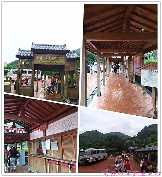 遊客中心是以往金瓜石車站整修後改建的,一進去就看到一個很復古的告示牌,上面標示公車車次表和淘金體驗的細項,淘金體驗一次是新台幣100元。櫃台有掛著三張復古海報,介紹黃金博物館能摸到純金大金磚,館內也有全台唯一金礦觀光坑道,還保有礦山各類日式建築風貌,看了就很吸引人耶!這個遊客中心可以說是我看過最有味道的遊客中心。