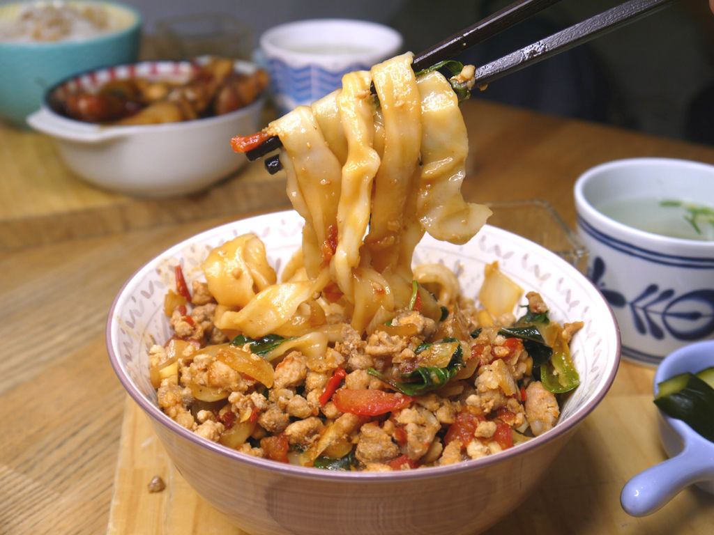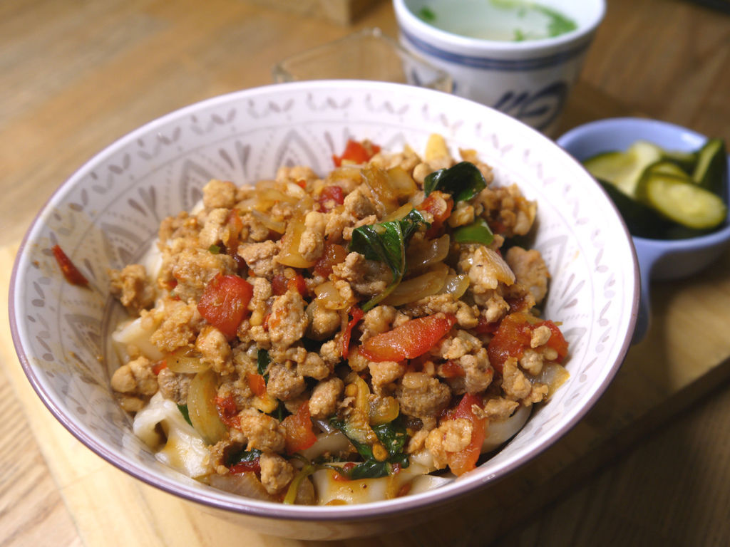 包含打拋豬肉麵、涼拌黃瓜、竹筍湯和山粉圓
