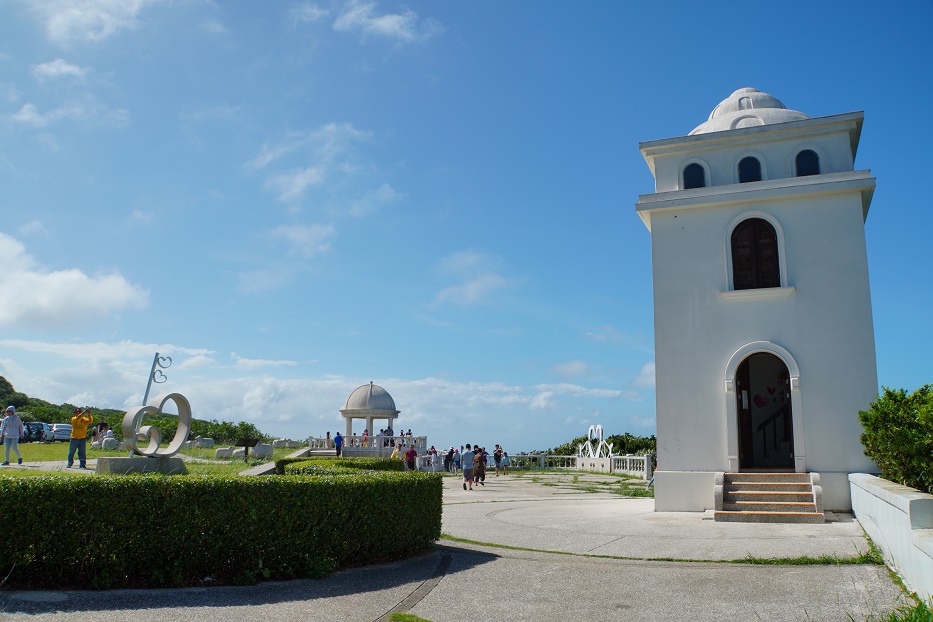 今天的風很大,下車時一個不留意差點被吹倒,所幸天上的雲並不多,看來可以不用擔心會下雨了。我們先進到前些日子因為疫情關係而沒開放的燈塔底部展示空間參觀,順便避避強風。稍事喘息之後,便來到外頭好好欣賞上次來不及細瞧的各式建築物。不管是涼亭或是愛心形狀的裝置藝術,都十分吸睛,讓人忍不住要按下快門,捕捉眼前美景。
