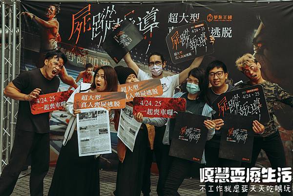最後一定要跟場外的喪屍來一張合照,第一次挑戰大型密室逃脫,就像看了一場真實的舞台劇,雖然不能跟迪士尼相比,但是演員的表情、情緒風格、肢體語言都非常到位,讓原本笑嘻嘻的一群人,瞬間大聲尖叫起來。