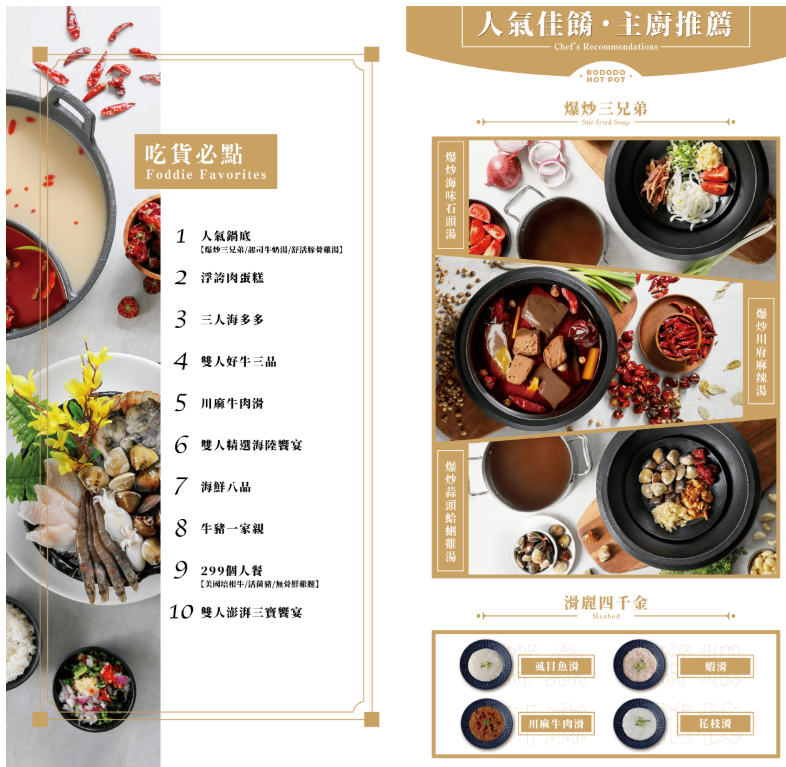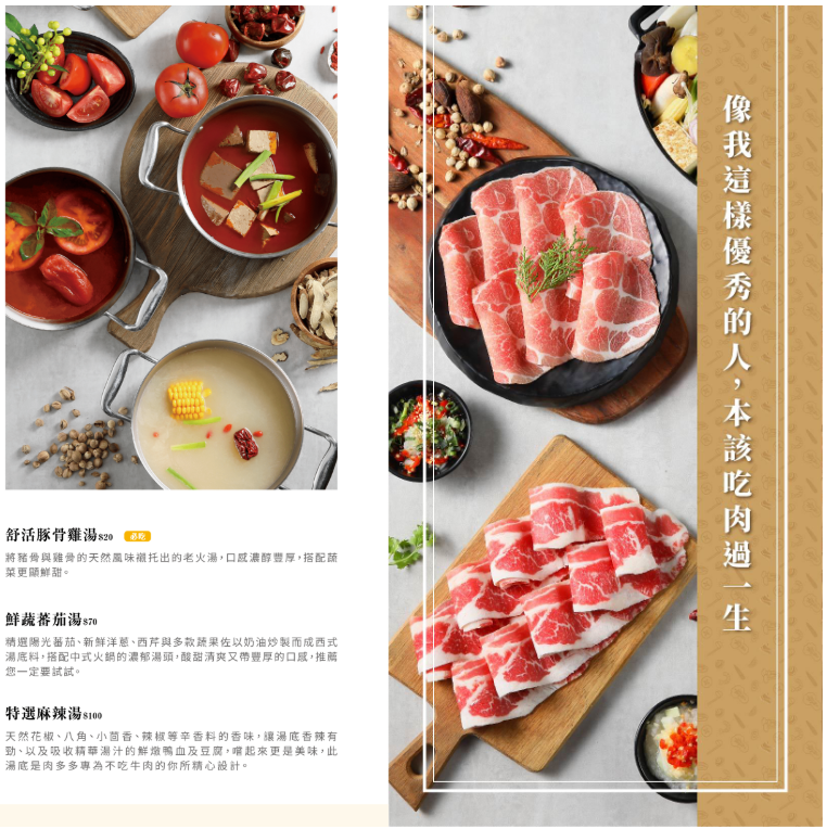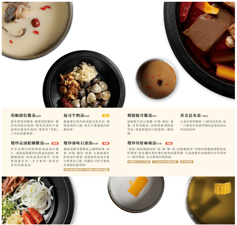 分別有胡椒豬肚雞湯、起司牛奶湯、爆炒蒜頭蛤蜊雞湯、爆炒海味石頭湯、藥膳豚骨雞、爆炒川府麻辣湯、黄金昆布、舒活豚骨雞湯、鮮蔬蕃茄湯跟特選麻辣湯
