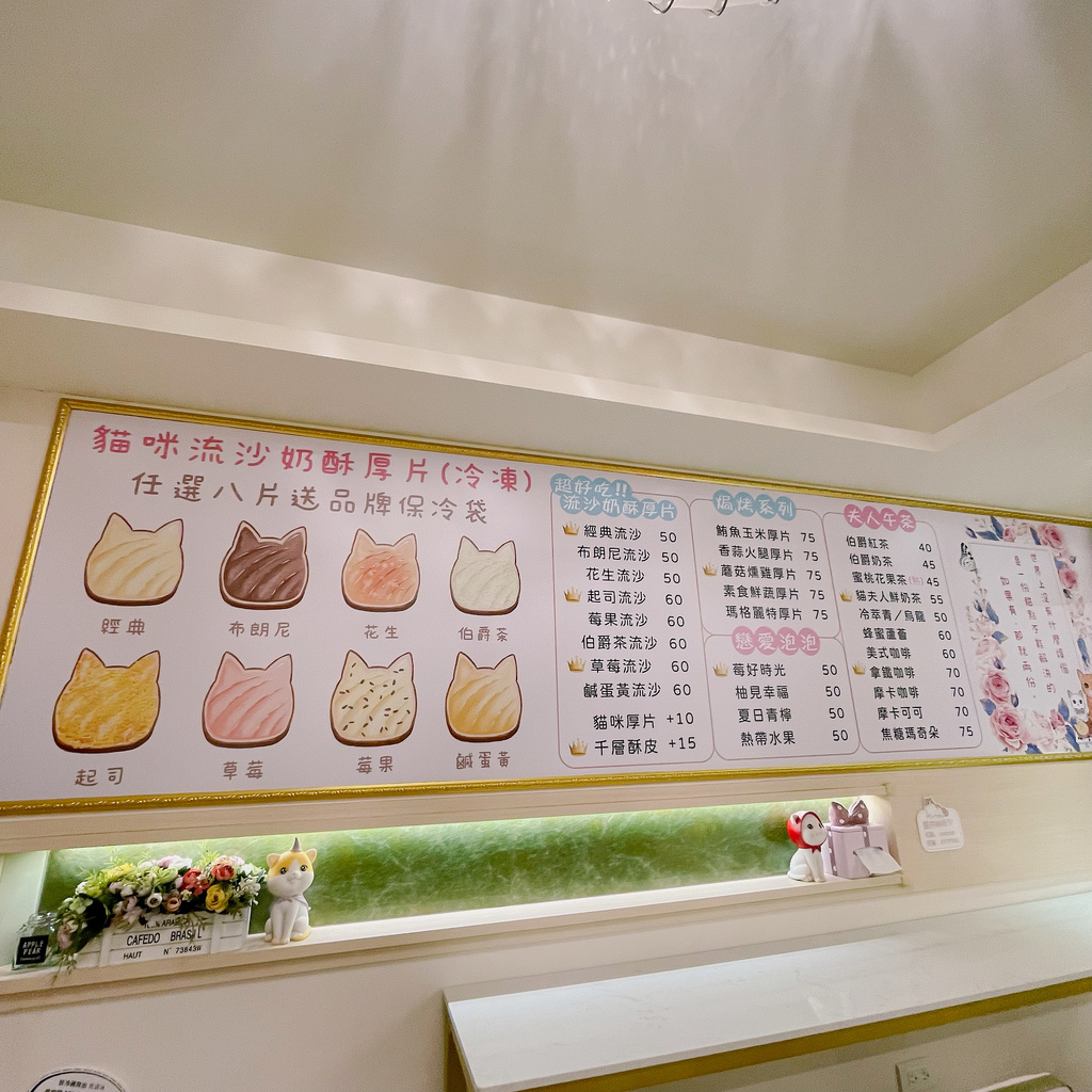這間為新店碧潭的貓夫人吐司店,店裡販售的餐點非常簡單就是流沙吐司與鹹的厚片還有一些飲品