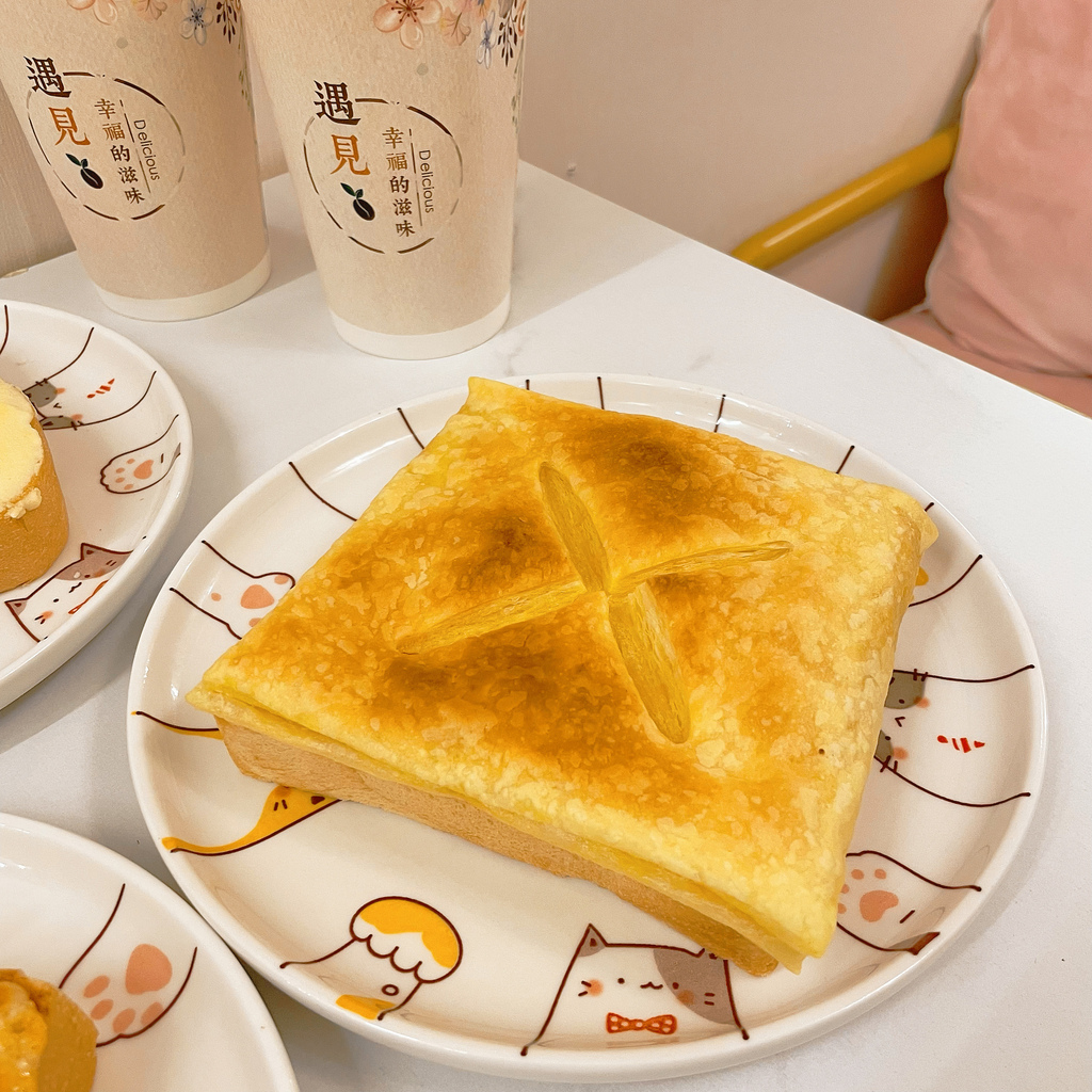 貓夫人還有一個比較特別的就是酥皮吐司在抹好的奶酥上面加上酥皮一起烤,真的是很特別的口感,酥皮是點鹹蛋黃口味的
