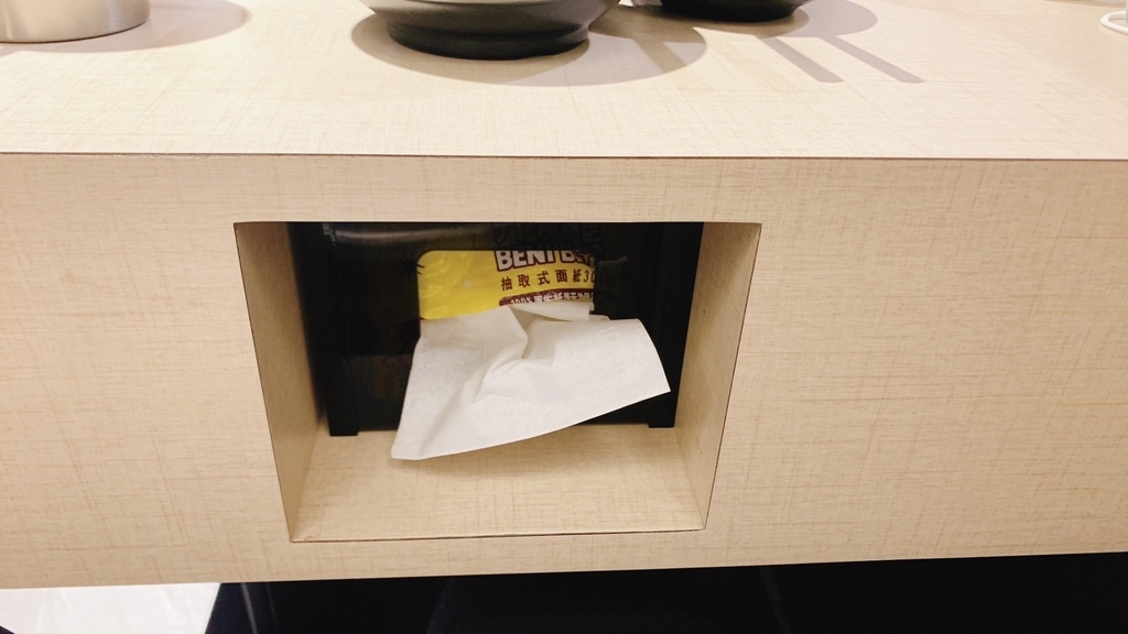 而且他的衛生紙是在位置的下方,桌子的中間有個凹槽,這樣的好處不僅是不會佔桌面空間,而且也不用透過別人再拿衛生紙,隨時可以自行抽取,很聰明的作法呢!!