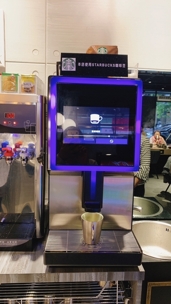 然後他的咖啡機是用星巴克的咖啡豆,好下重本哦