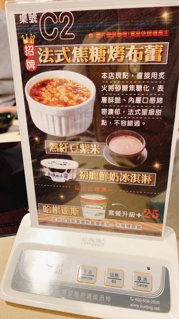 吃完正餐,還有甜點的部分,在桌面有看板介紹,再快吃完時,可以跟店員點餐,
