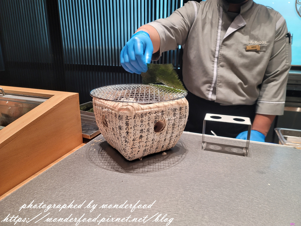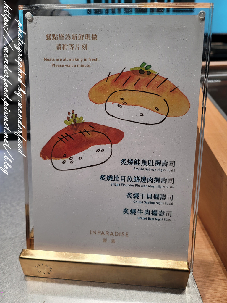 現做炙燒握壽司(炙燒鮭魚肚握壽司、炙燒比目魚鰭邊肉握壽司、炙燒干貝握壽司、炙燒牛肉握壽司)