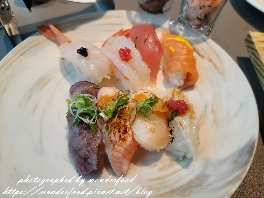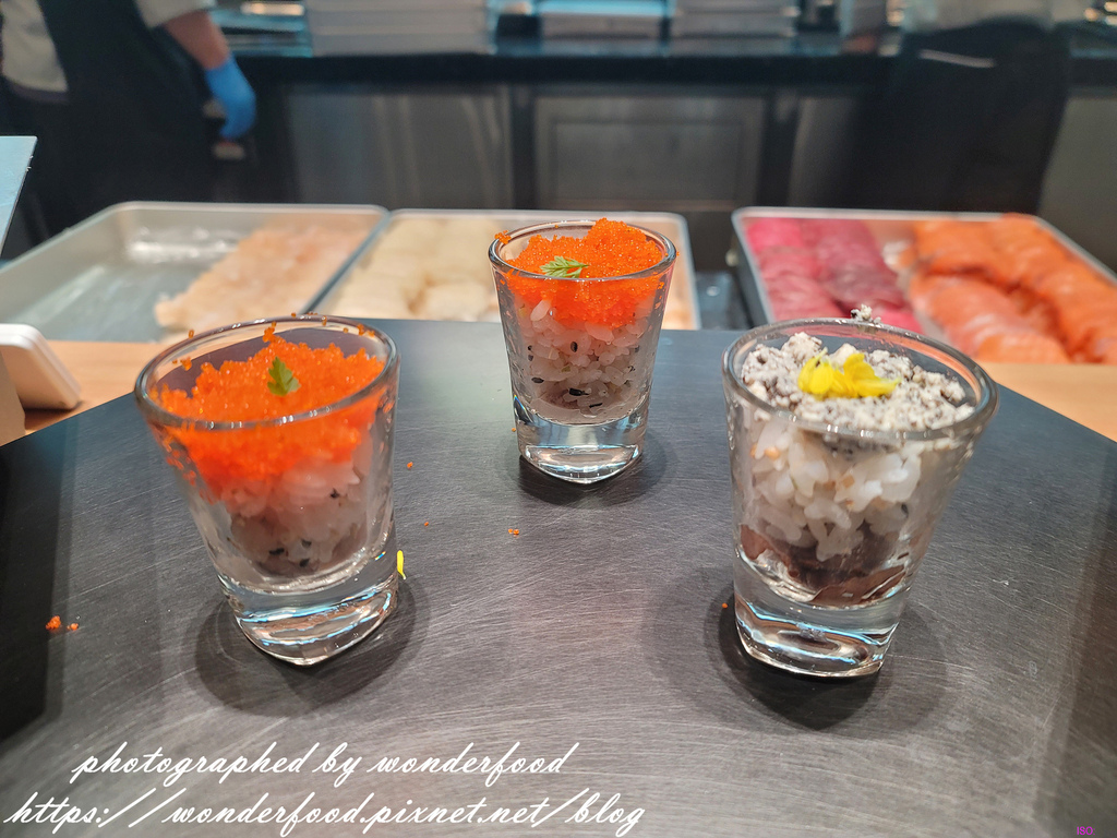 甜蝦握壽司、鮭魚握壽司、鮪魚握壽司、旗魚握壽司、炙明太子墨魚杯壽司、松露牛肉杯壽司