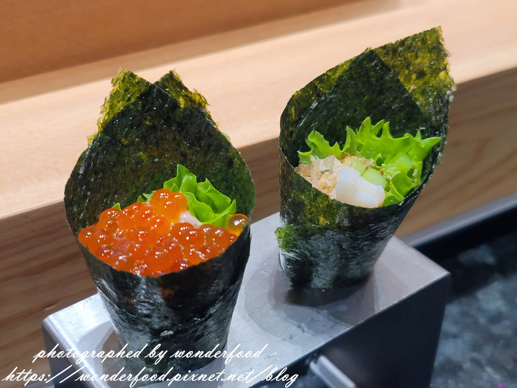生魚片、現做手捲(嫩蘆筍蝦手捲、鮭魚親子手捲、蔥花鮪魚手捲和牛蒡絲手捲)