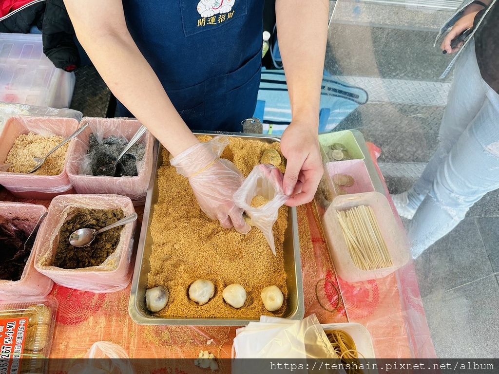 走近一看,原來正是我們今天特地前來尋覓的美食-「來來麻糬」。「來來麻糬」一個才賣 10 元,比台北便宜多了,不買一些來解饞,真的是對不起自己。