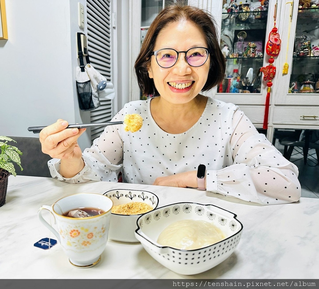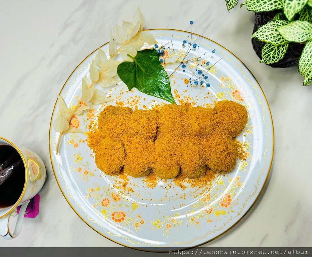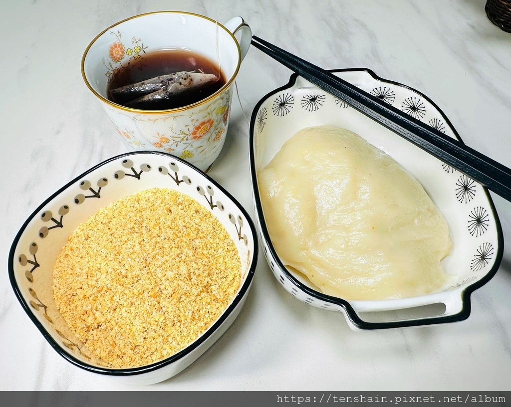 一回到家,老婆就迫不及待找出美美的食器,分別把麻糬和花生粉倒出來,再泡一杯花茶,準備享用美味的下午茶了。原味麻糬的量給得很足,花生粉更是給得超多,特愛花生粉的我們超開心,因為每一口麻糬都可以沾好沾滿,完全不用怕花生粉不夠用。