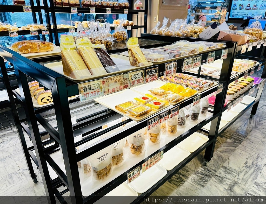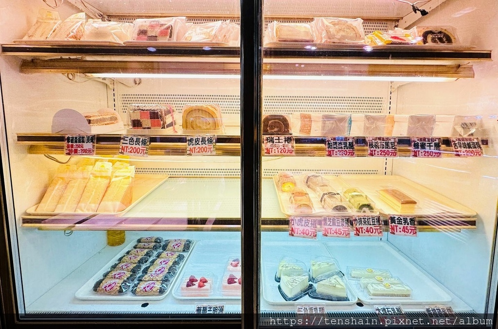 冷藏櫃裡的主角是長條形蛋糕,有拿破崙蛋糕、三色長條、虎皮長條、瑞士捲、帕瑪森乳酪、核桃布朗尼、蜂蜜千層,就連真正古早味的鹹蛋糕都有。其中的"三色長條"更讓我眼睛一亮,因為這是大女兒特別喜歡的小甜點,在我家附近的麵包店,一小片就要 45 元,這裡一長條卻只要 200 元!這麼便宜,當然一定要順手帶一條給她。