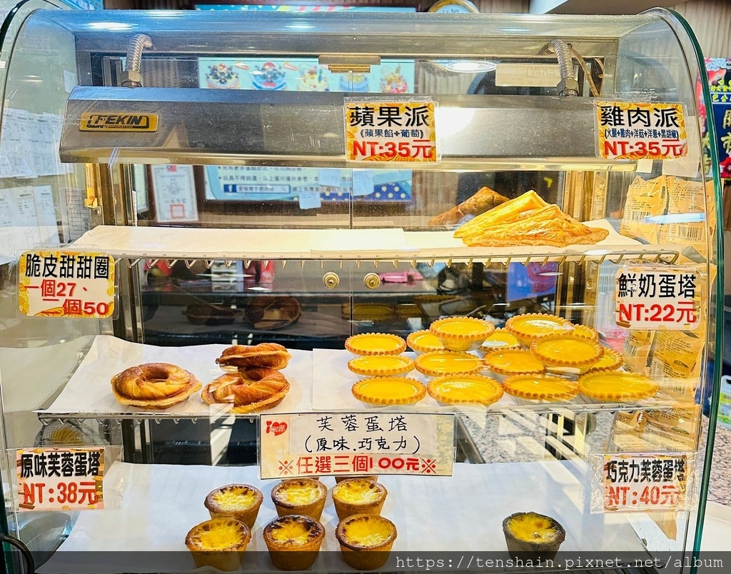 櫃台上有個保溫箱,各種派、甜甜圈、各式蛋塔,個個賣相誘人,看得我口水直流。