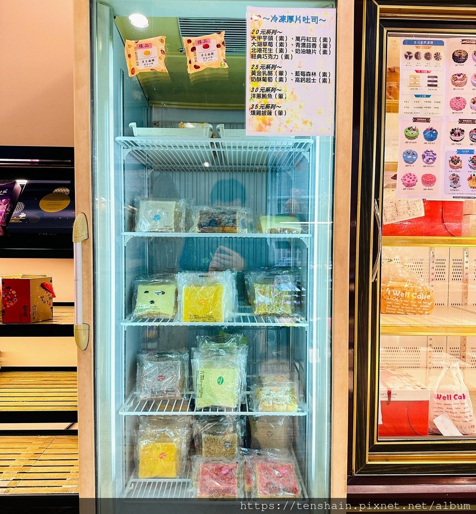 冷凍櫃裡的商品是冷凍厚片吐司,有甜有鹹,有葷有素,最便宜的 20 元,最貴的洋蔥鮪魚也只要 30 元,甚至還有 35 元的燻雞披薩。忙碌的職業婦女,買一些回家冷凍,早上放進烤箱或是微波爐熱一下,就是一家人美味又營養的早餐。吐司總共有 12 種,外加燻雞披薩,可以連吃兩個禮拜不重複。