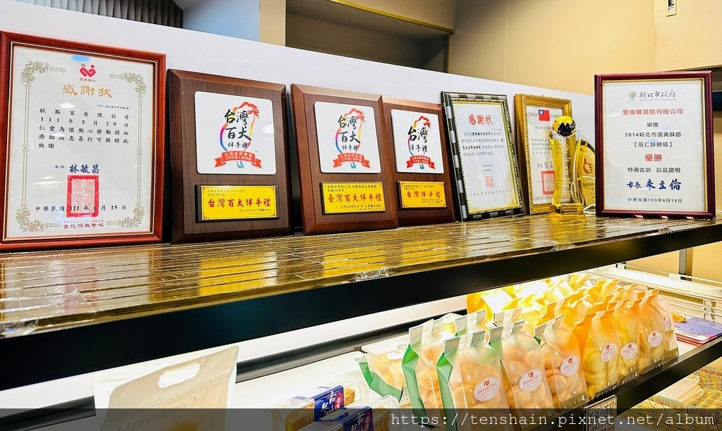 我說「愛維爾手感烘焙」獲獎無數,可不是隨便說說,看看這一列獎牌,獲得「台灣百大伴手禮」的有 107 年度的「爆漿金棗酥」、109 年度的「彩虹蛋黃酥」、110 年度的「土鳳梨脆皮蛋黃酥」,2014 年也曾獲新北市蛋黃酥節【伍仁酥餅組】優勝。