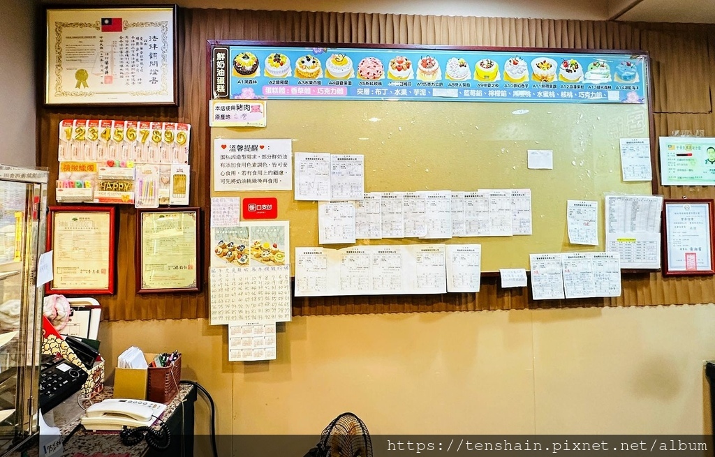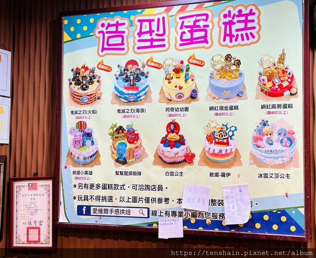 牆壁上的造型蛋糕照片,只是所有款式的一部分,更多的蛋糕款式可以直接洽詢店員。