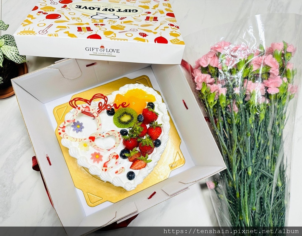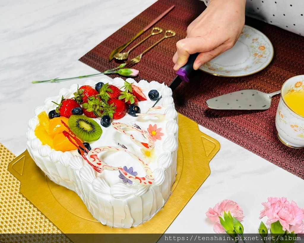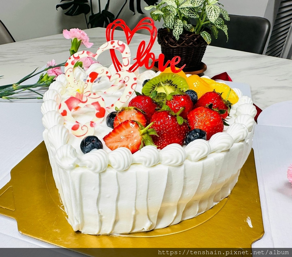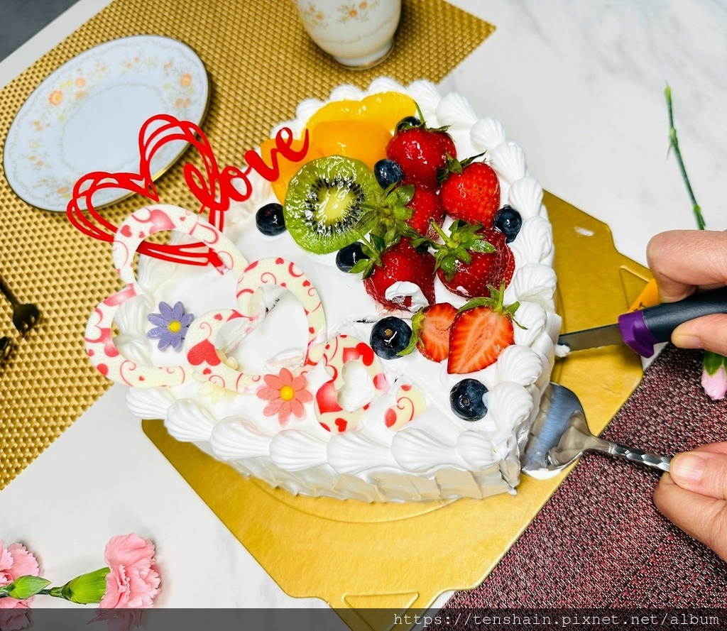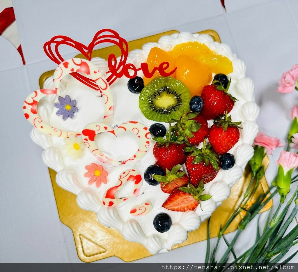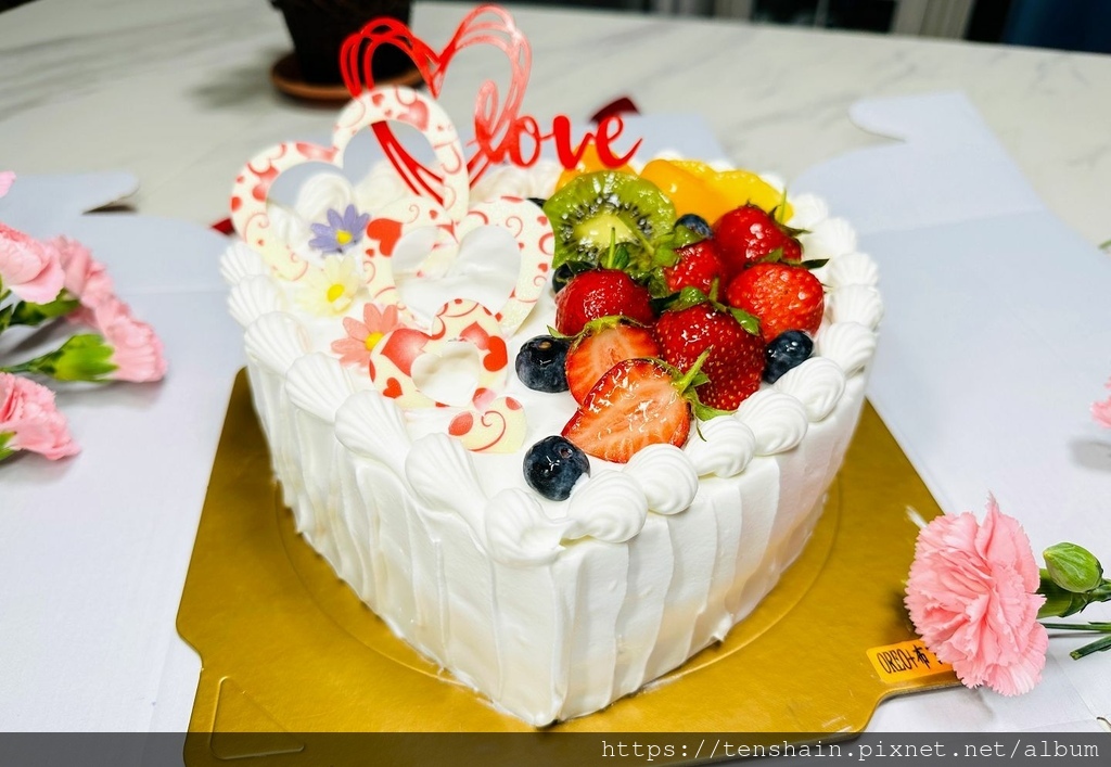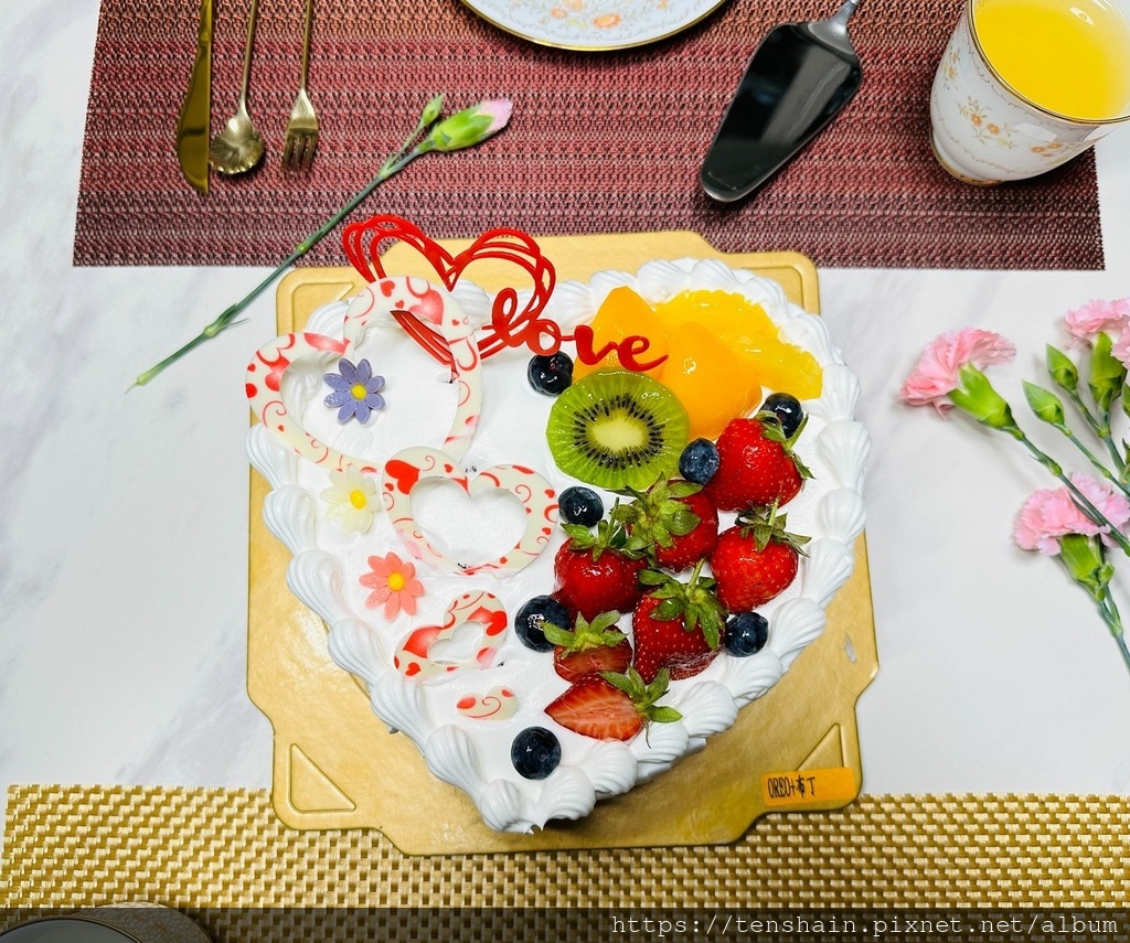 哇!這個母親節蛋糕也太美了吧!愛心的造型,雪白的奶油,配上紅豔豔的草莓、黃澄澄的水蜜桃和鳳梨、綠色的奇異果、藍色的藍莓,五顏六色,色彩超繽紛!