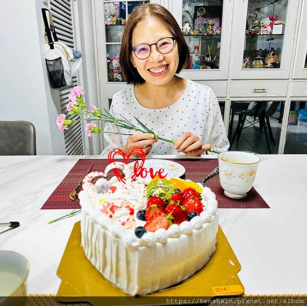 手捧康乃馨,獻上漂亮的蛋糕,老婆笑得很開心!因為我說:「我把所有的心,都送給你了!」數數看,這個蛋糕裡,總共有幾顆愛心?