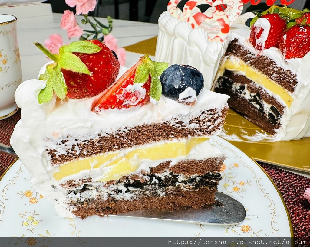 雪白的奶油,有如絲綢般的滑順,一入口就化成香甜的奶香,甜滋滋;微微苦甜的巧克力蛋糕體,鬆軟綿密,芳香溼潤;兩者完美搭配,甜而不膩,口感迷人。軟糯滑嫩的布丁帶著一點 Q 度,延長蛋糕在口腔中停留的時間,讓味蕾的享受更上一層樓。接著是 OREO 的酥脆,為原本軟綿的蛋糕,增添了咀嚼的樂趣。酸甜兼具的各色水果,則扮演畫龍點睛的功效,給味覺帶來不同的驚喜。這樣一個有著繽紛口感,迷人造型和馥郁果香的蛋糕,不但美味至極,而且可以脣齒留香久久,拿來慶祝母親節,再適合也不過了!