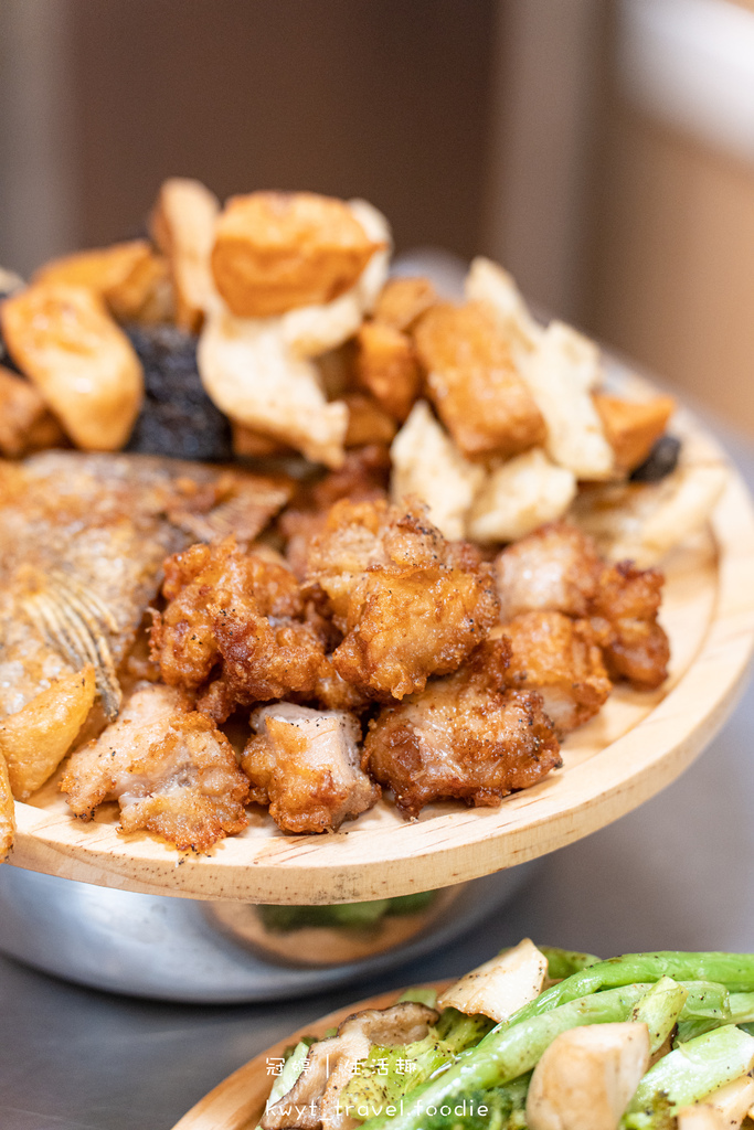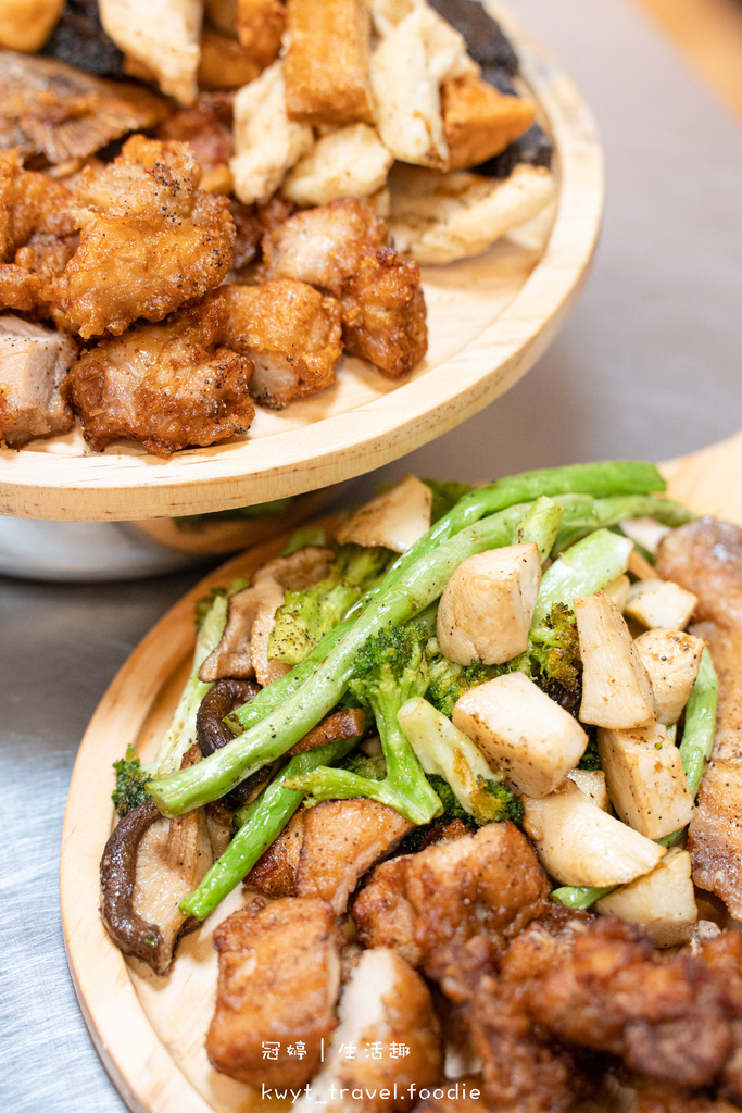 香菇、杏鮑菇在酥炸一番之後,鎖住了飽滿水分,可以吃到滑嫩口感裡的自然鮮甜、多汁。