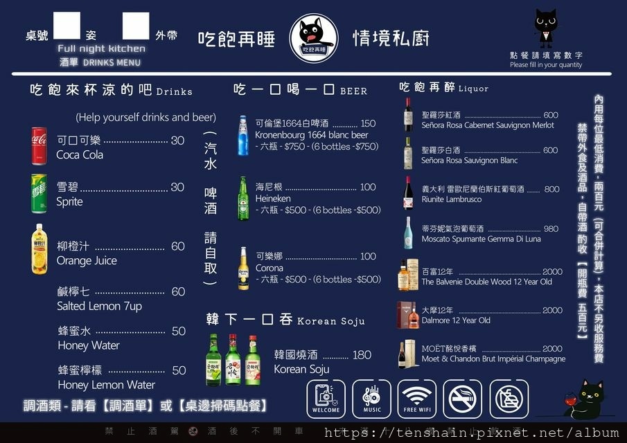 飲品也有許多選擇,"吃飽來杯涼的吧"是無酒精飲料、"吃一口喝一口"是各種啤酒、"韓下一口吞"是韓國燒酒、"吃飽再醉"就是酒精濃度高一點的酒。
