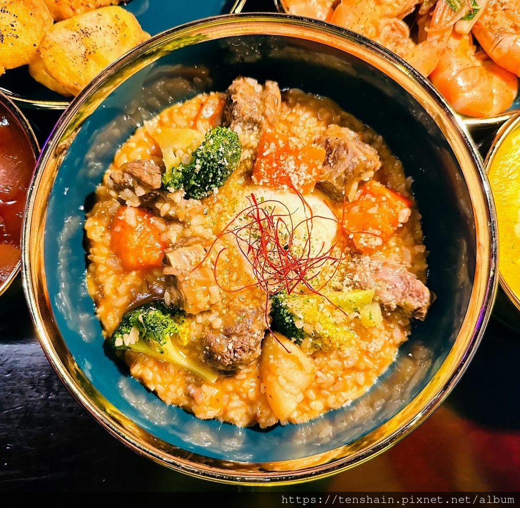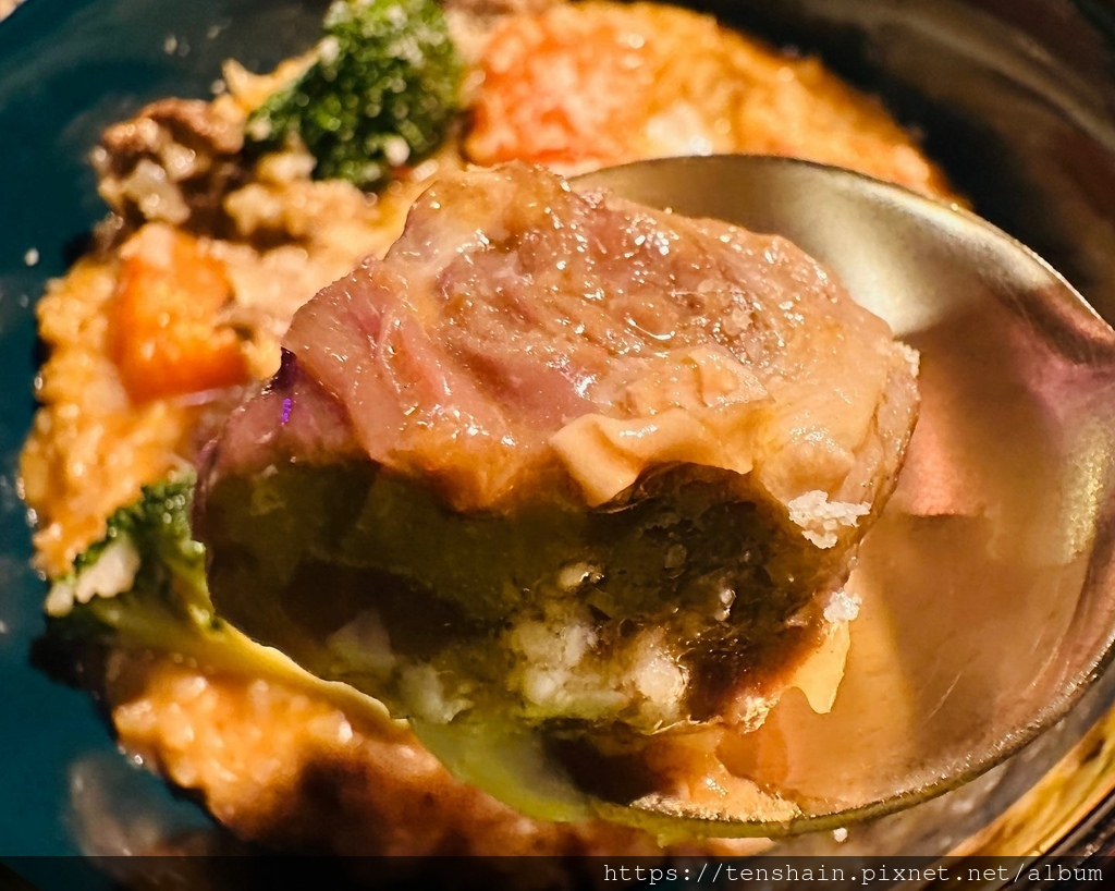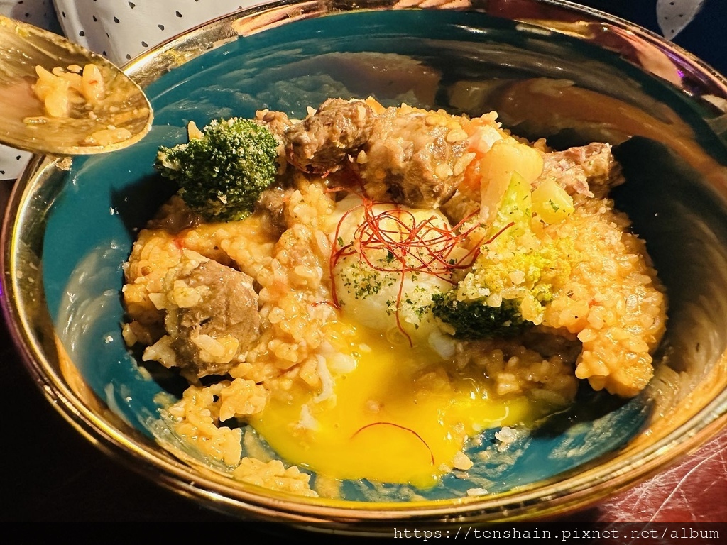 以時間換取的美味,才能滋味雋永!牛肉連筋都燉得軟爛,筷子輕輕一夾就斷,不過仍保有軟嫩的口感,不會失去存在感。富含油脂的部分吃起來特別香,因為油脂香和酒香、牛肉香已經完美地融合在一起,不分彼此。燉飯的中間,還藏著一顆水波蛋,一劃開,蛋黃就像岩漿一樣流瀉而下,畫面超療癒!
