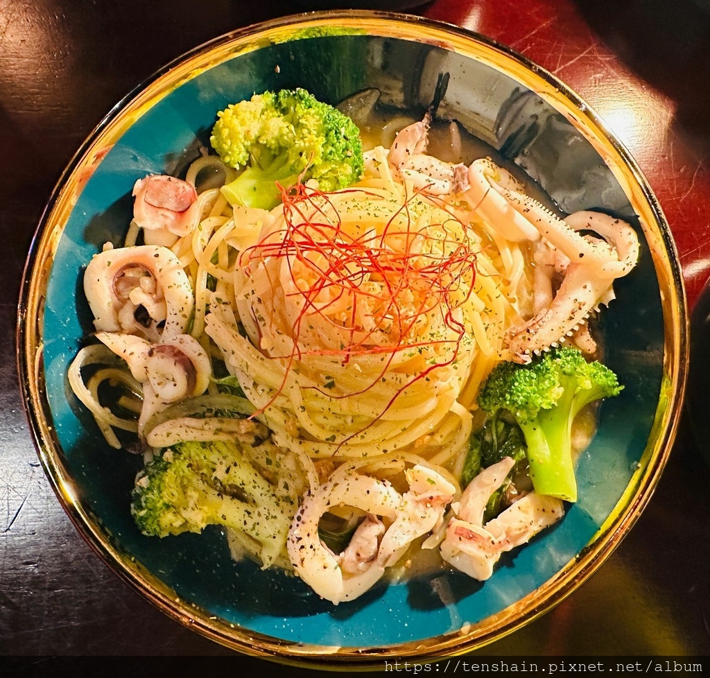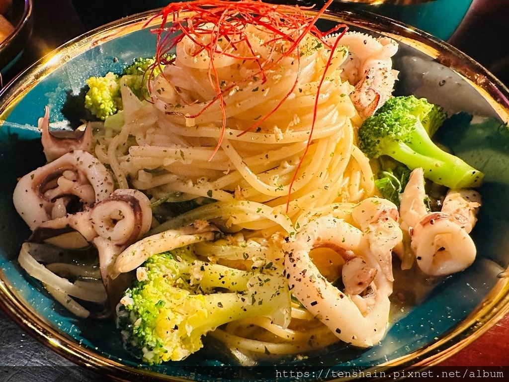 這是一道用鼻子就聞得到美味的義大利麵,濃郁的蒜香鑽入鼻腔,叫人垂涎三尺。黃色的義大利麵、綠色的花椰菜、紅色的乾辣椒絲,再加上白色的透抽,好一幅色彩繽紛的可餐秀色!
