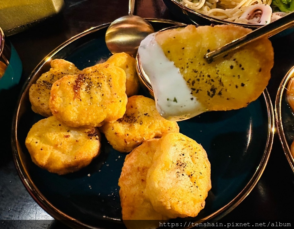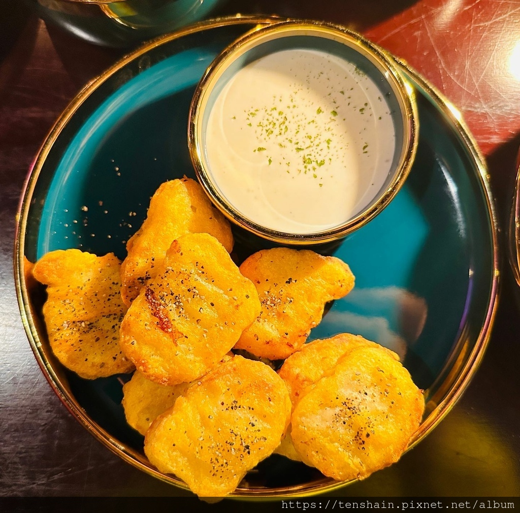 這道"氣炸雞塊",顯然不只及格,因為軟嫩多汁,吃來不乾不膩。再加上強烈風味的藍紋起司沾醬,突顯雞肉的鮮甜,比起一般速食店的雞塊,又高了一個層次。
