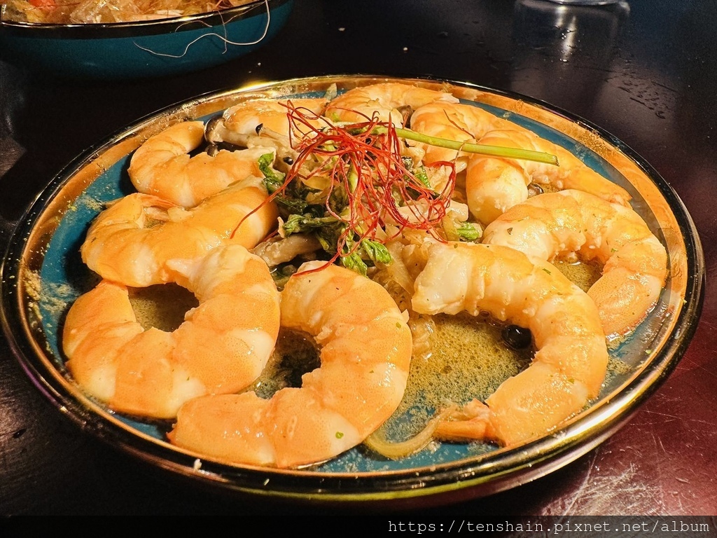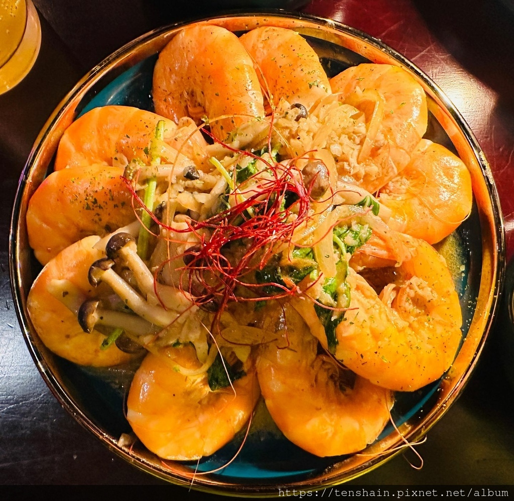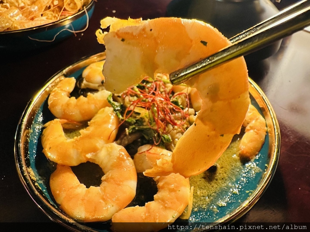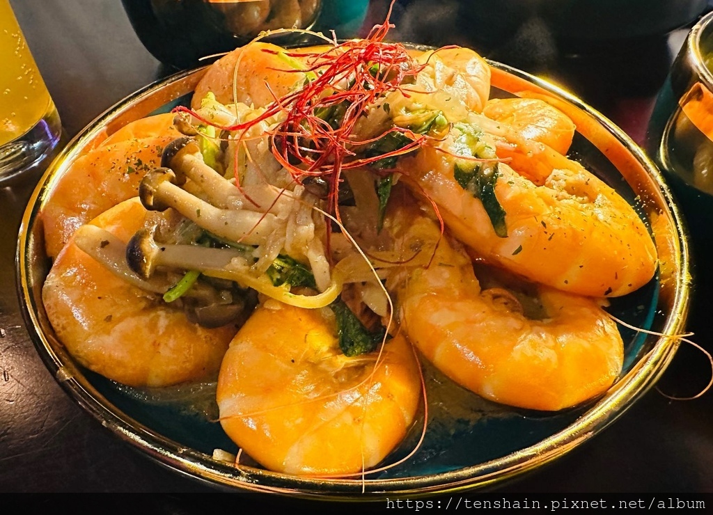 吃這道檸檬蝦,記得一定要沾點醬汁再吃,讓蝦子帶著檸檬香氣的微酸,更能嚐出蝦子的鮮甜滋味。也可以配點鴻喜菇、九層塔一起咀嚼,海陸鮮美滋味交織,蝦子吃起來更有層次。這是一道開胃又下酒的菜色,不管你喝不喝酒,都要點起來。