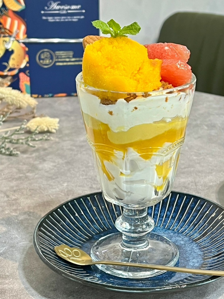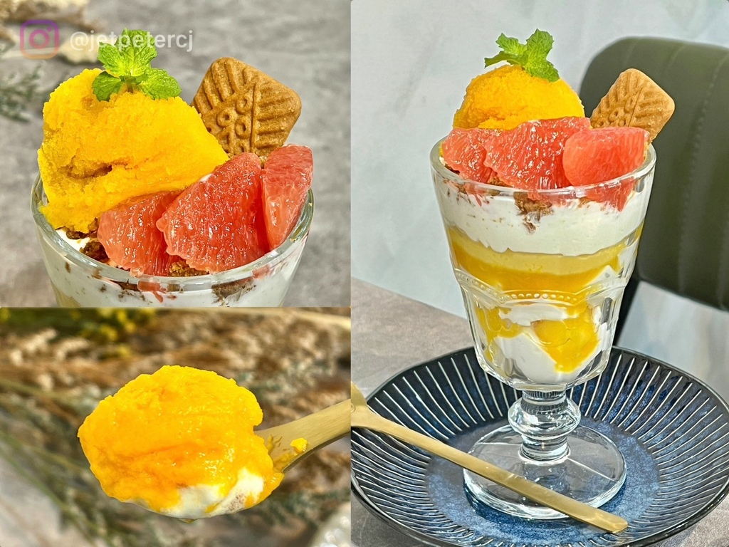 炎炎夏日就想來杯消暑甜品,芒果芭菲杯用料有夠狂!超級費工滿滿配料,非常有層次感~滋味豐富酸甜又開味!芒果果凍跟耶果凍,雙重滋味酸中帶點椰奶香,脆脆的果凍口感好好吃~中間還有酥脆的比利時餅乾,增添酥脆口感~上頭的自製芒果雪酪,酸甜冰涼的滋味,相當消暑又冰涼~再來上一口葡萄柚及芒果果肉,真材實料的芒果芭非杯吃過一次就愛上!