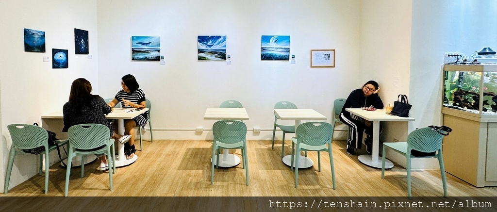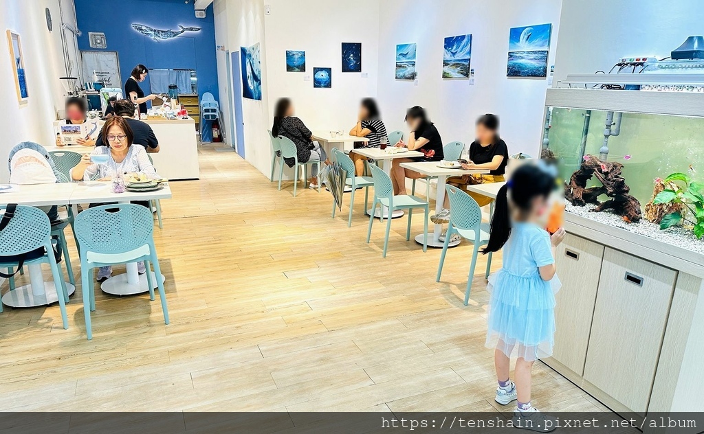 走進店內,海洋的意象更清晰了。視線的盡頭是一隻徜徉在藍海中的座頭鯨,牆上掛著一幅幅鯨鯊與海龜的畫作,門口還有一個水族箱,養著色彩鮮艷的魚蝦。五顏六色的小魚,對小朋友有超強的吸引力,照片中的小女孩,一進門就站在水族箱前看得目不轉睛,吃飯這件事早已拋在腦後。