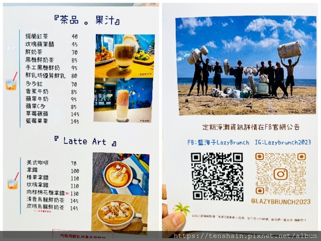 前面說老闆對海洋有熱愛,可不是說假的,看看菜單最後一頁就知道。從粉絲頁得知,老闆和同事常在下班後及假日,一起享受海洋潛水的各種樂趣與訓練,而且會定期號召對海洋有熱愛的同好一起淨灘,這樣熱愛海洋和環保的行為,讓我十分敬佩!