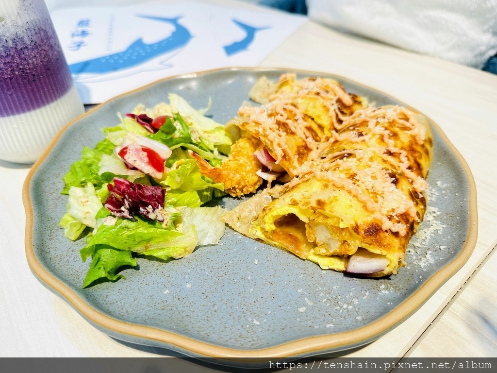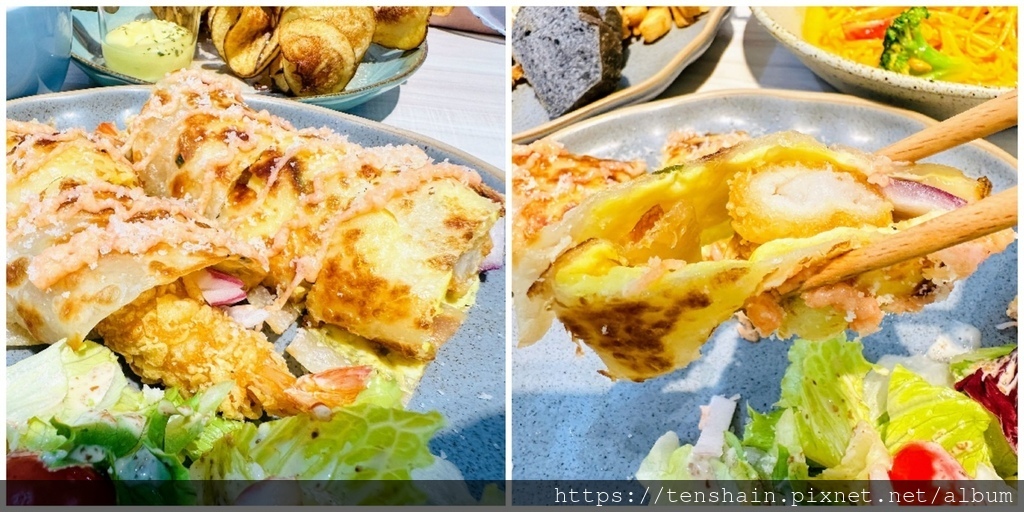 炸蝦超大,比蛋餅還長出一大截,粉薄脆、蝦鮮甜,好吃得連我這個蝦控都讚不絕口!手工餅皮嚼勁迷人,煎得焦香酥脆,口感絕佳。明太子的鹹香與顆粒感,增加口感層次,起司的香,錦上添花。多種香氣的堆疊,口感更濃郁,這時候紫洋蔥就扮演解膩的效果,整個蛋餅的滋味,完美!