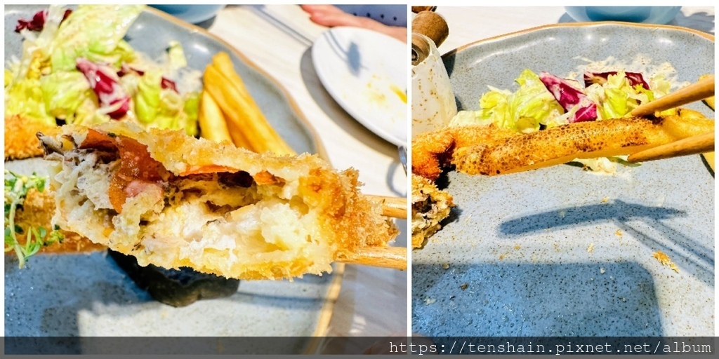 薯 Q 毛,105 元,用整顆馬鈴薯現點現刨,螺旋狀帶皮馬鈴薯薄片,層層堆疊成一座小山,淋上巧克力醬,再灑上刨絲起司,另附特調黃芥末醬。這是一道好吃又好拍的甜食,絕對會讓少女尖叫,吸睛度百分百!超級薄的薄片,脆得不可思議,充滿巧克力的甜和起司的香,只要吃一口就停不下來。特調的黃芥末醬,香甜不嗆,若是覺得巧克力醬太甜,可以沾一點平衡一下味道。不過,根本來不及沾醬,整盤薯 Q 毛就被我們搶食得一乾二淨,好吃的程度可見一斑。