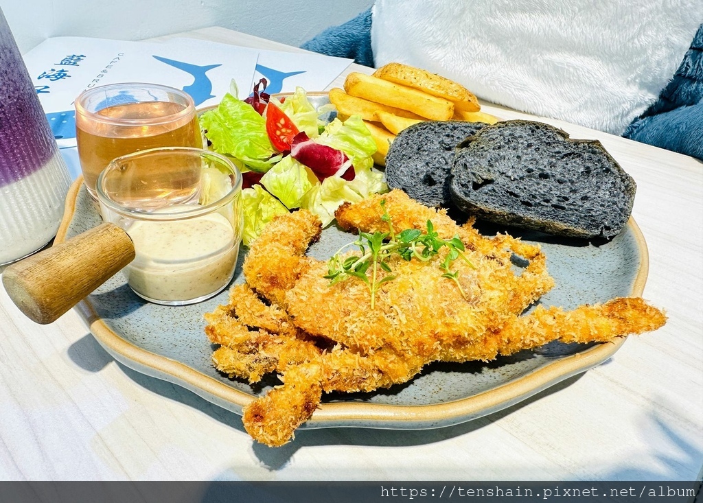 「蟹蟹你,早安」,340 元,這道"手工拼盤"的內容很豐富,除了主角現炸軟殼蟹,還有綜合生菜、薯條、竹炭麵包、果醋 1 杯,另附一杯胡麻沙拉醬。