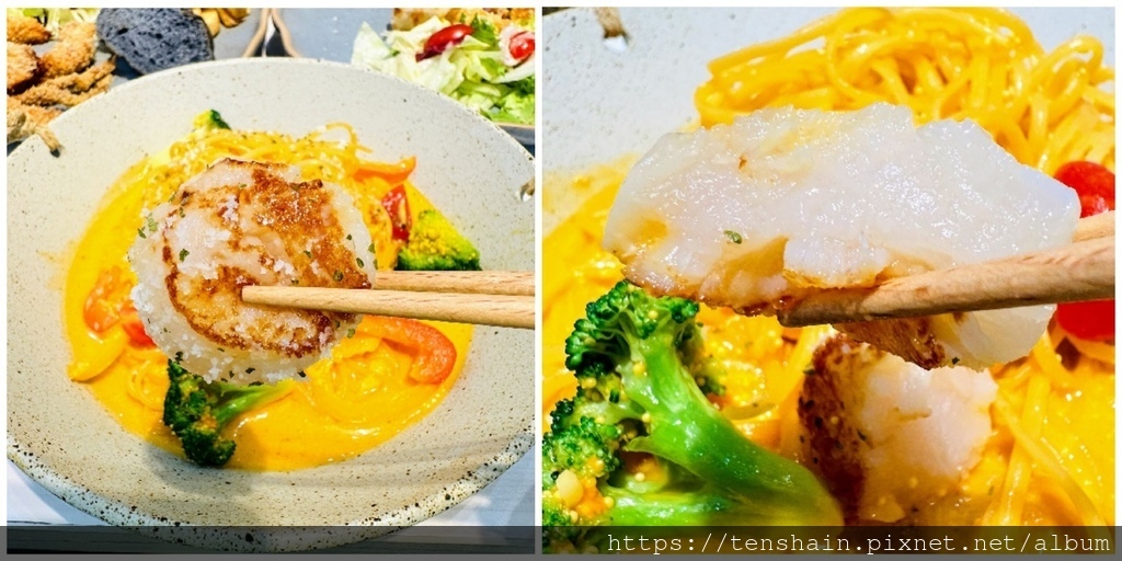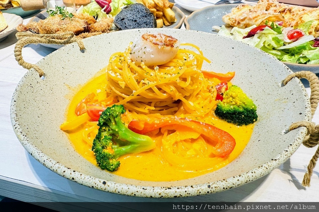 海膽醬干貝魚卵義大利麵,290 元,義大利進口扁麵佐手工熬煮海膽醬,灑上大把魚卵,搭配鮮蔬,再以日本生食級干貝畫龍點睛。
