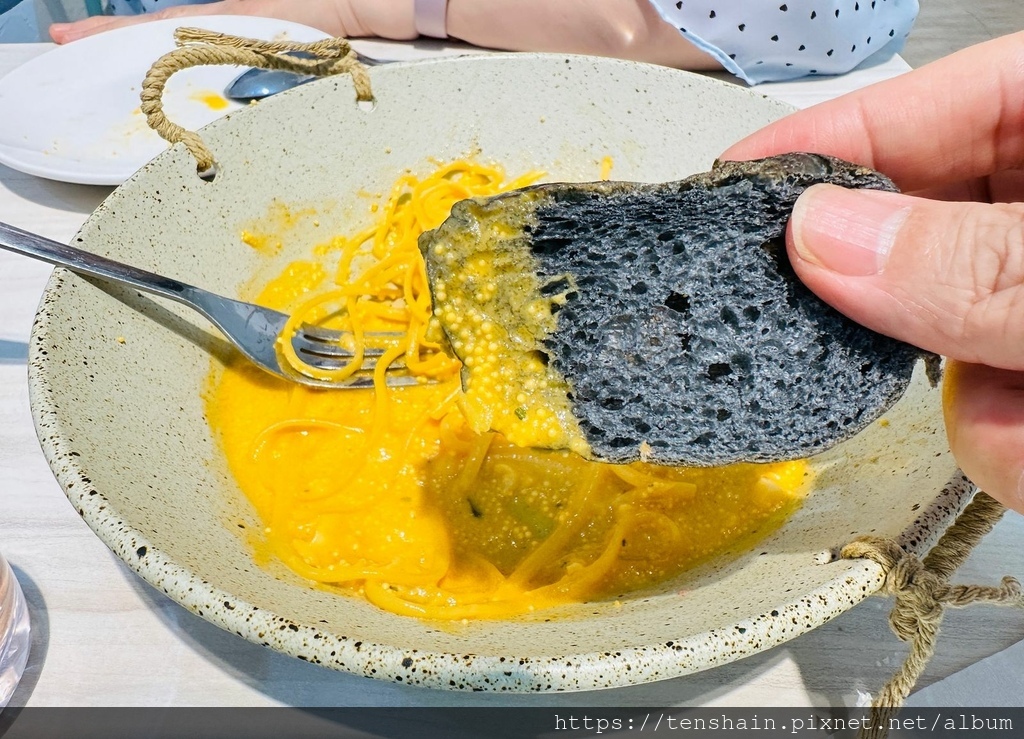 剛剛留下來的竹炭麵包,現在派上用場了。老闆用料真的沒有在手軟的,義大利麵吃完了,還剩下超多混合著魚卵的海膽醬,用來沾竹炭麵包吃,超好吃!這麼奢侈的吃法,除了「藍海子 lazybrunch」,哪裡找得到?