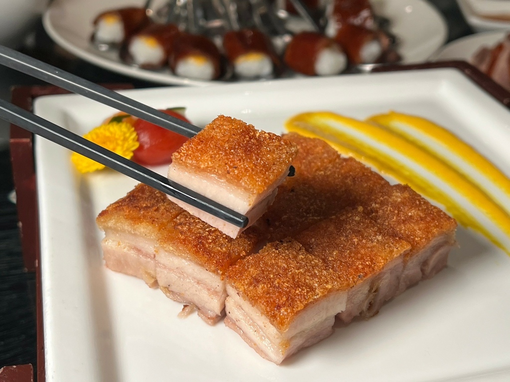 卡滋卡滋酥脆聲響徹雲霄,以往我不太愛吃燒肉,多數偏油,然而典華雅聚的金磚燒腩仔,以瘦肉為主,完全不膩口,也不會乾柴