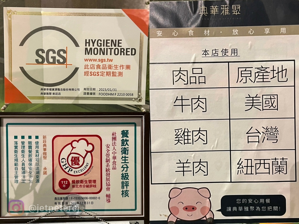 典華雅聚食材來源標示清楚,SGS定期監測、衛生乾淨獲得政府優等的認證,來這邊用餐不僅可以吃得開心,也能相當安心