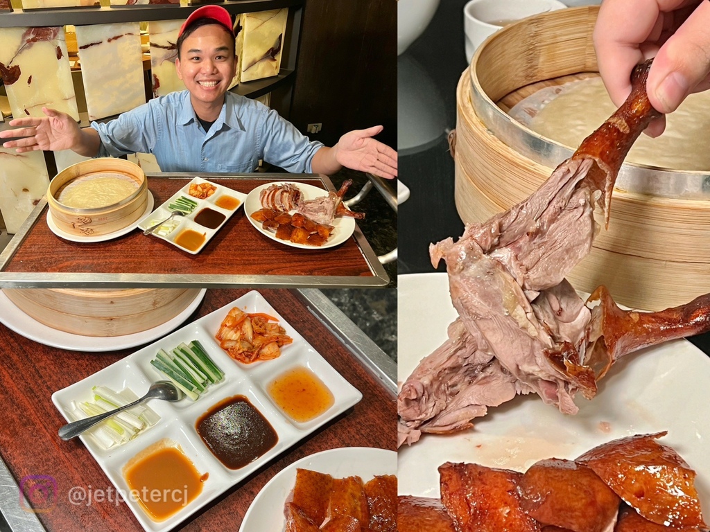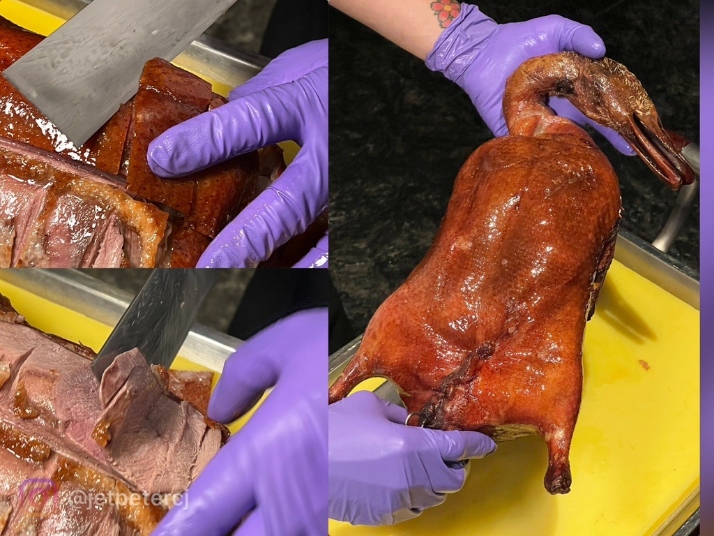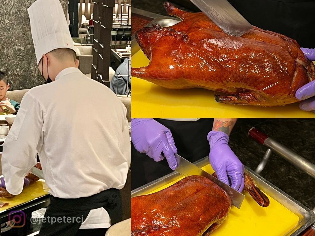 師傅在桌邊現場處理剛出爐的烤鴨,精湛的刀工,片鴨切得超美,濕潤的肉質、豐富的油脂通通不流失~
