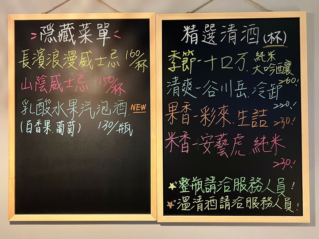 清酒每次都會更新,牆上都會有隱藏版菜單,喜歡嚐鮮的朋友,三不五時就可以來暮樂町報到!