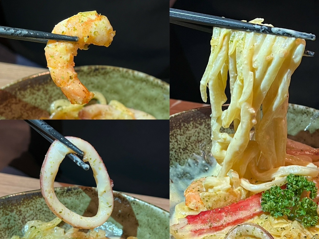 4.吃暮樂町居酒屋不怕吃不飽,白醬海鮮烏龍香濃入味,烏龍麵條相當彈牙,沾裹滿滿的白醬濕潤好入口~愛吃飯的朋友,也有日式傳統鮭魚湯泡飯、鍋氣十足的菇菇炒飯等選擇,來這兒吃飽喝足相當幸福