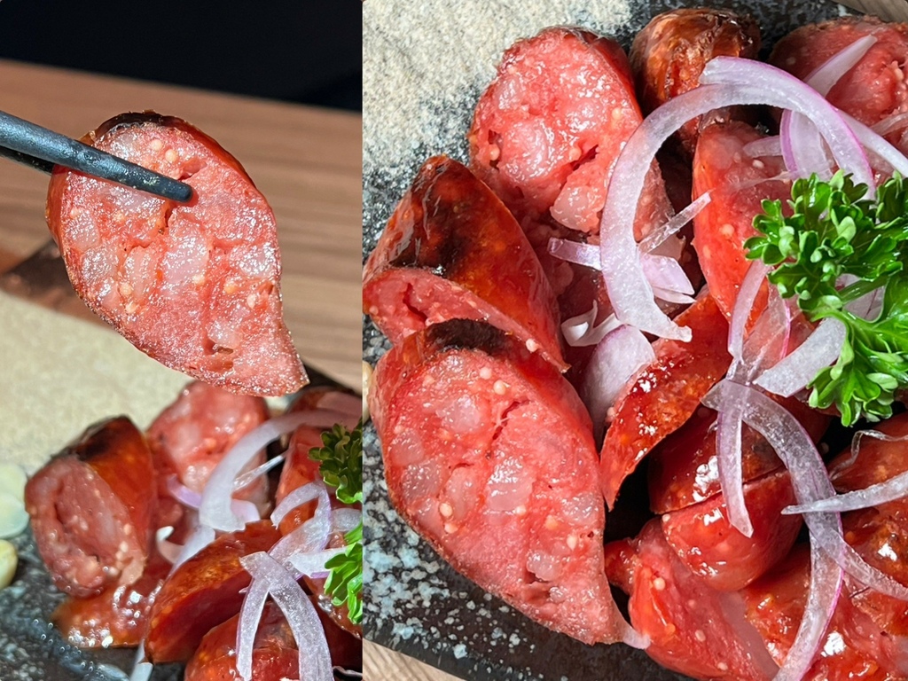 吃香腸就要搭配蒜頭片,口感紮實不會油膩,淡淡酒香不會過於刺鼻,酒香能帶出香腸的美味,當下酒菜真的再適合不過了